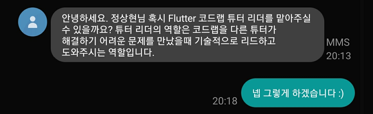 원래는 Flutter 코드랩 튜터로 신청했고, 담당자님에게 플루터 튜터에 선정되었습니다!